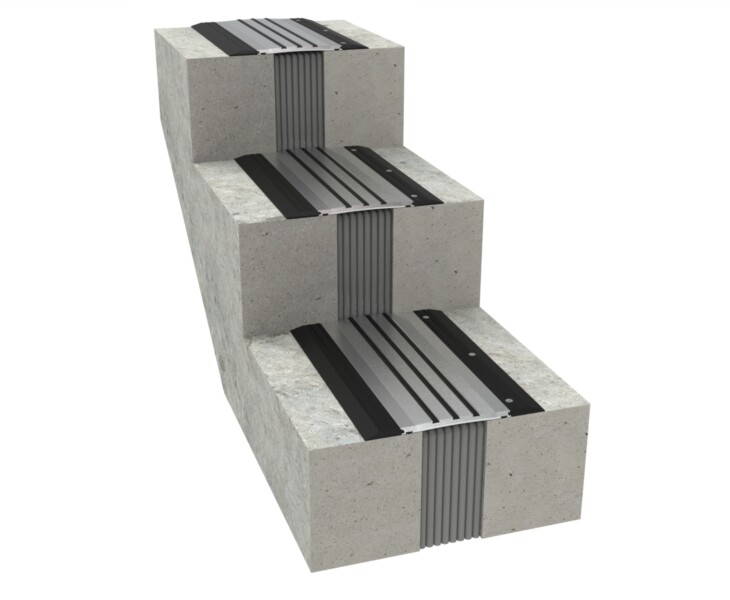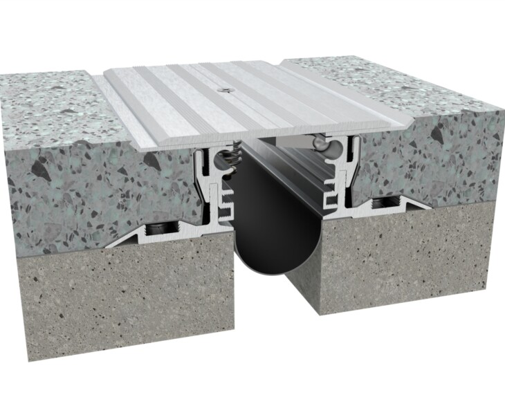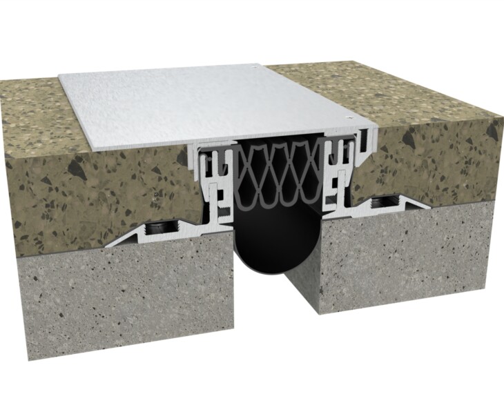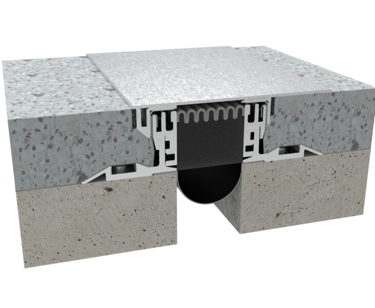 The DIH Series is a seismic floor joint with hinged plates and vibration dampers, designed for heavy rolling loads and optional waterproofing in demanding environments.